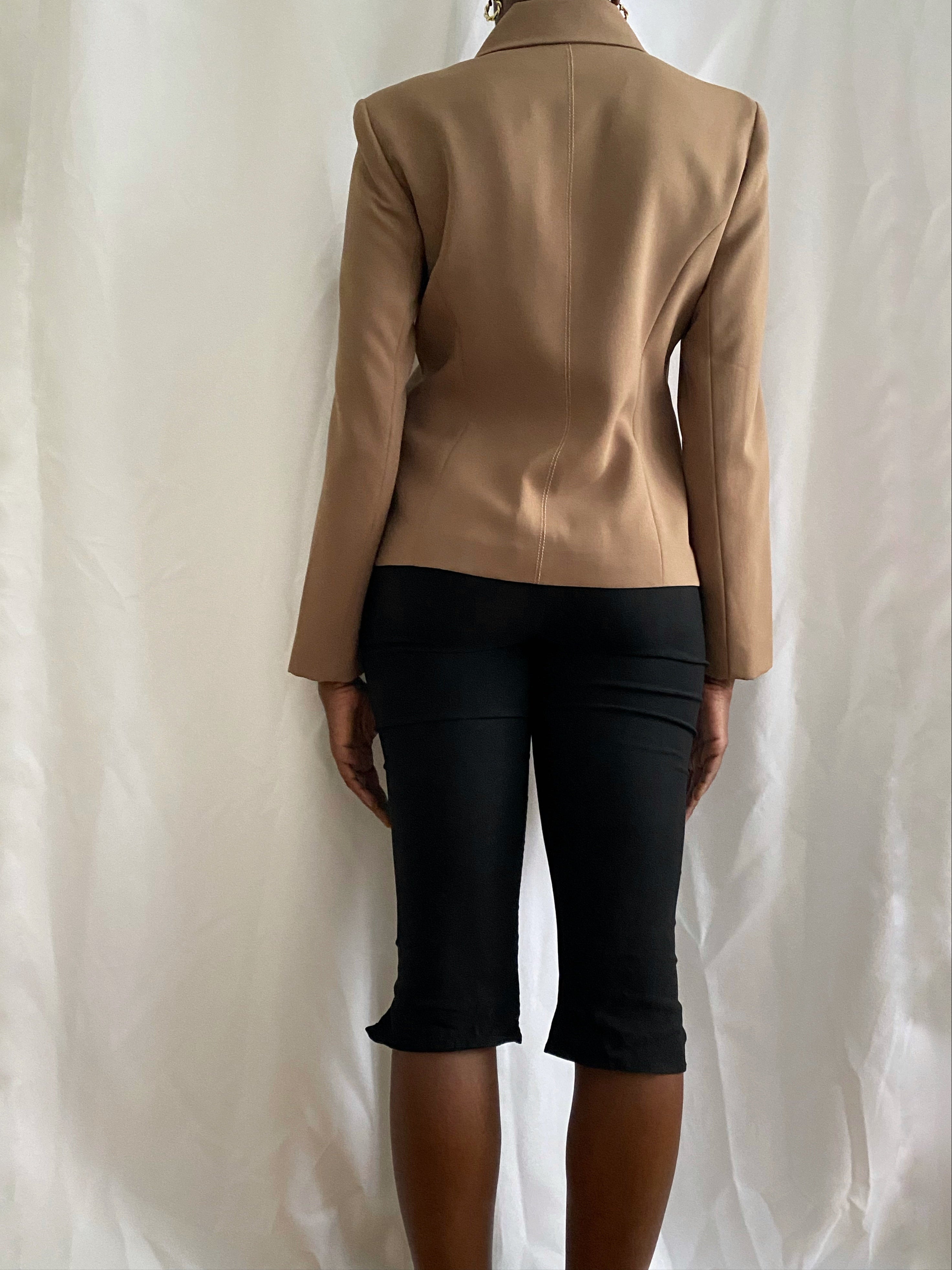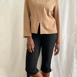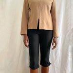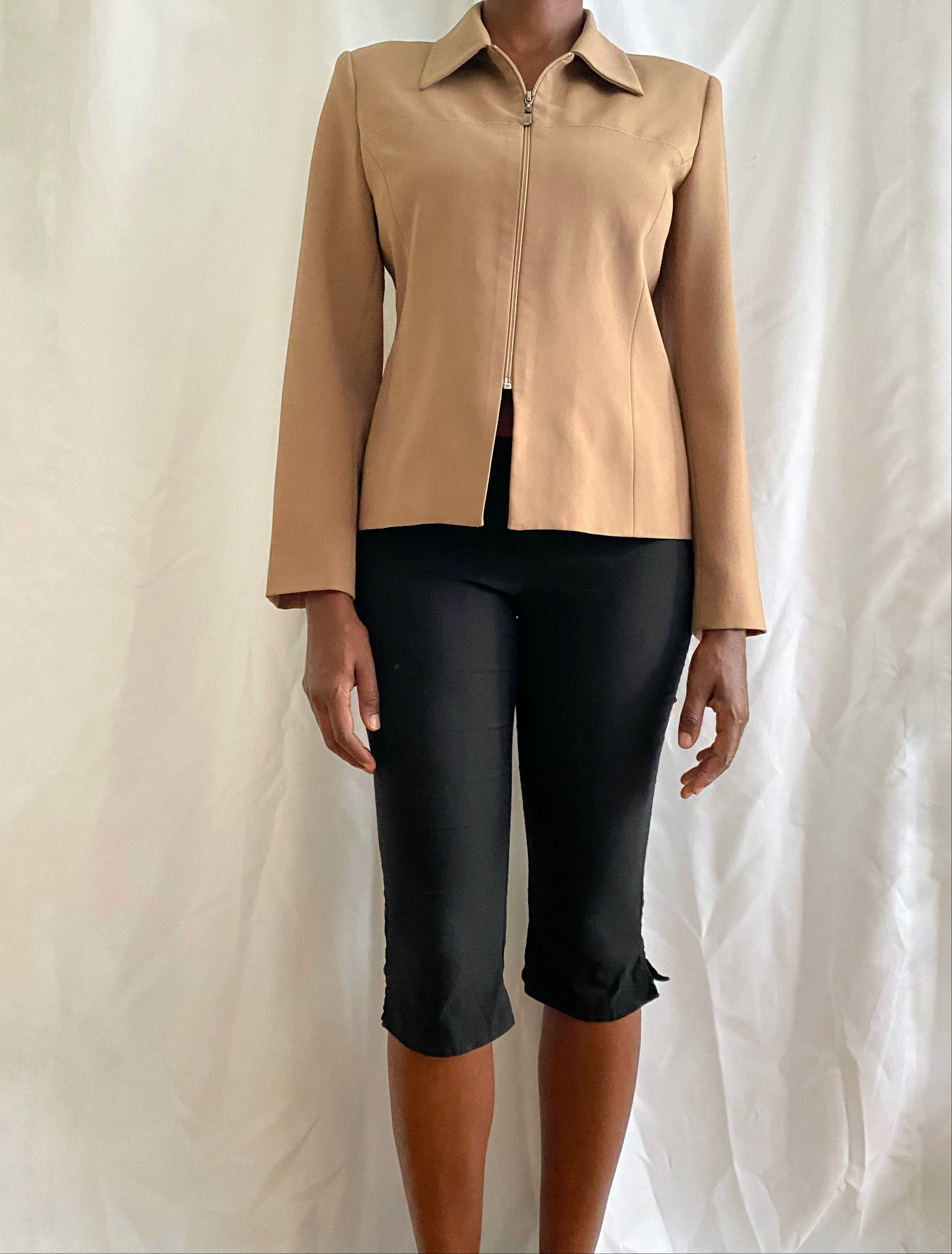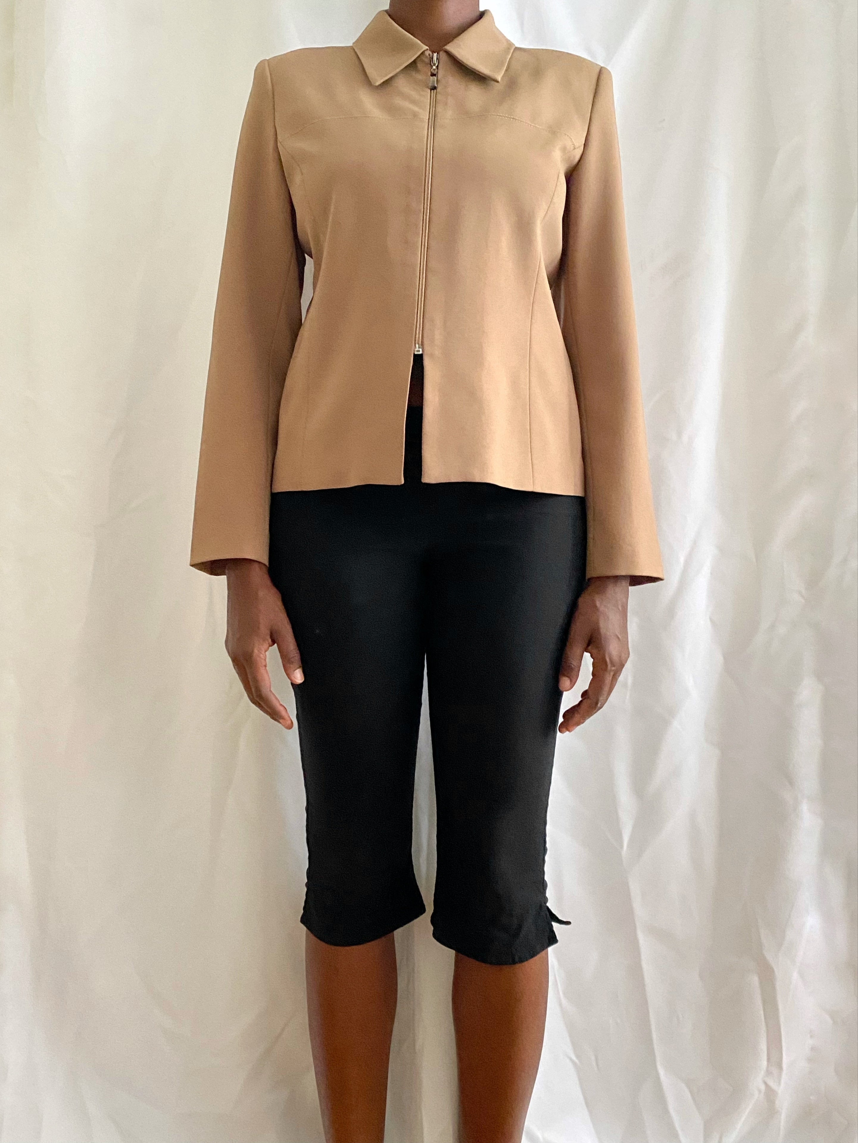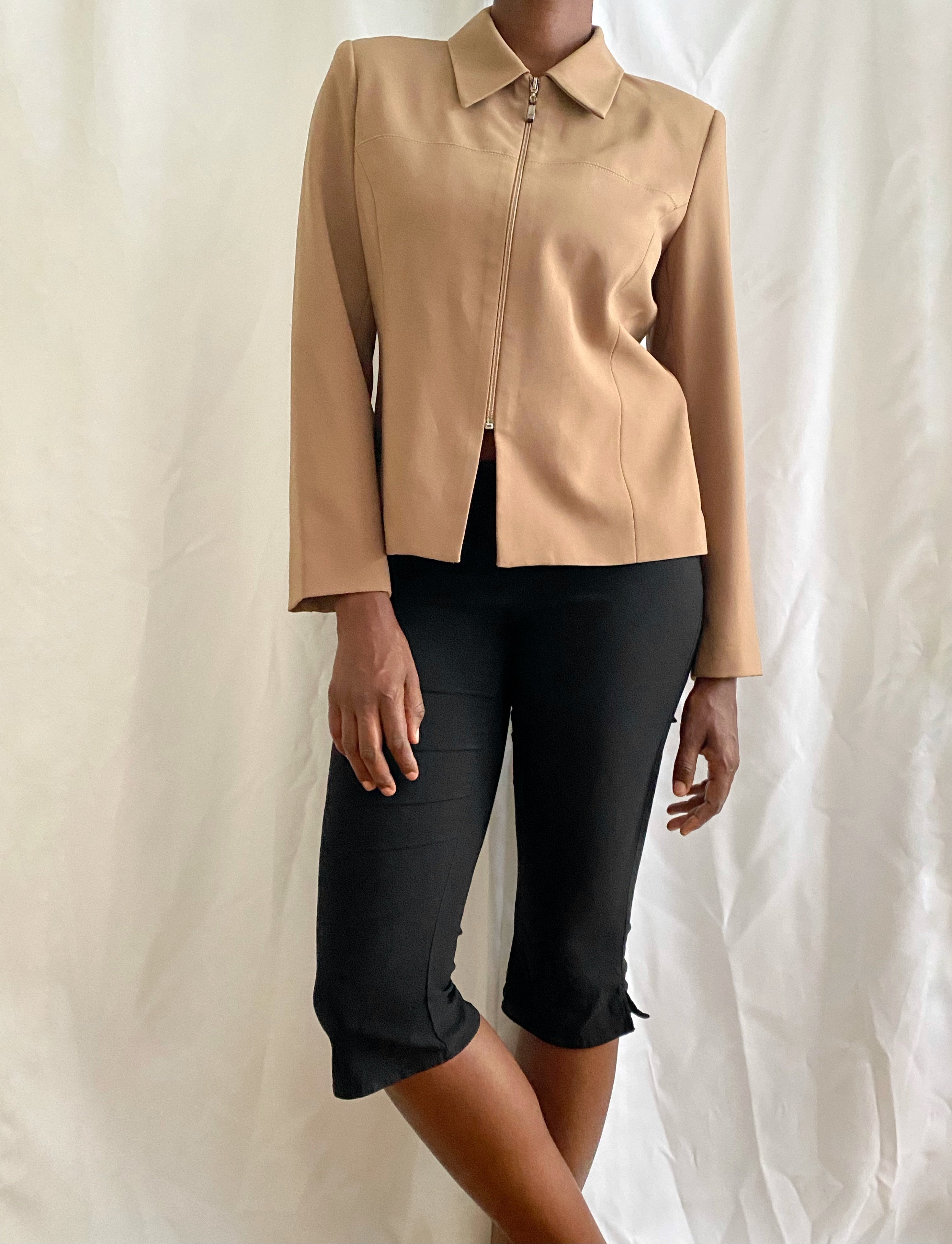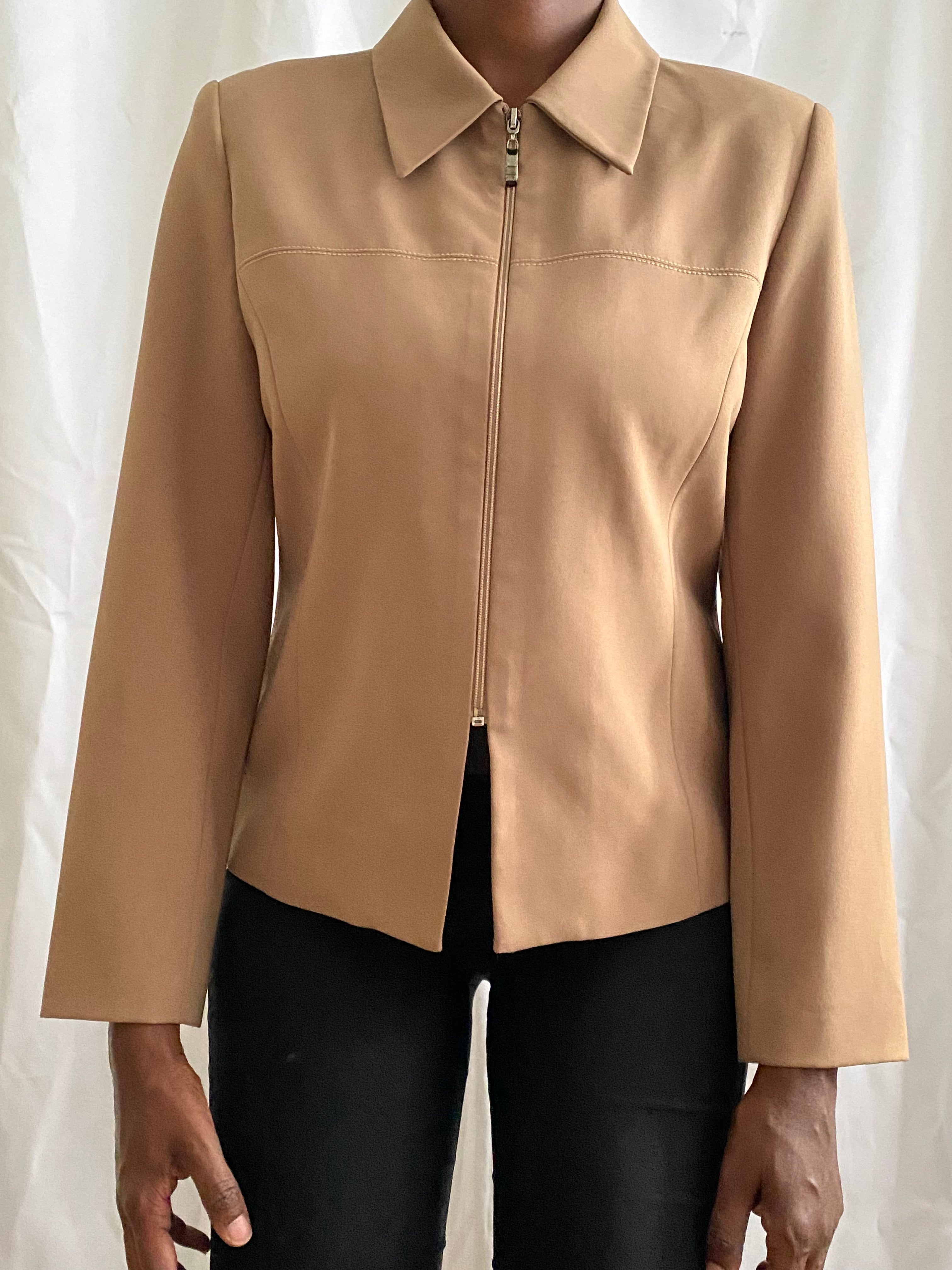 Unique shirt-jacket in a beautiful camel/beige color perfect for fall. Straight collar, long sleeves, overstitch details, front zipper. The length of the zipper doesn't go all the way to the hem, giving a cool edge to a classic.