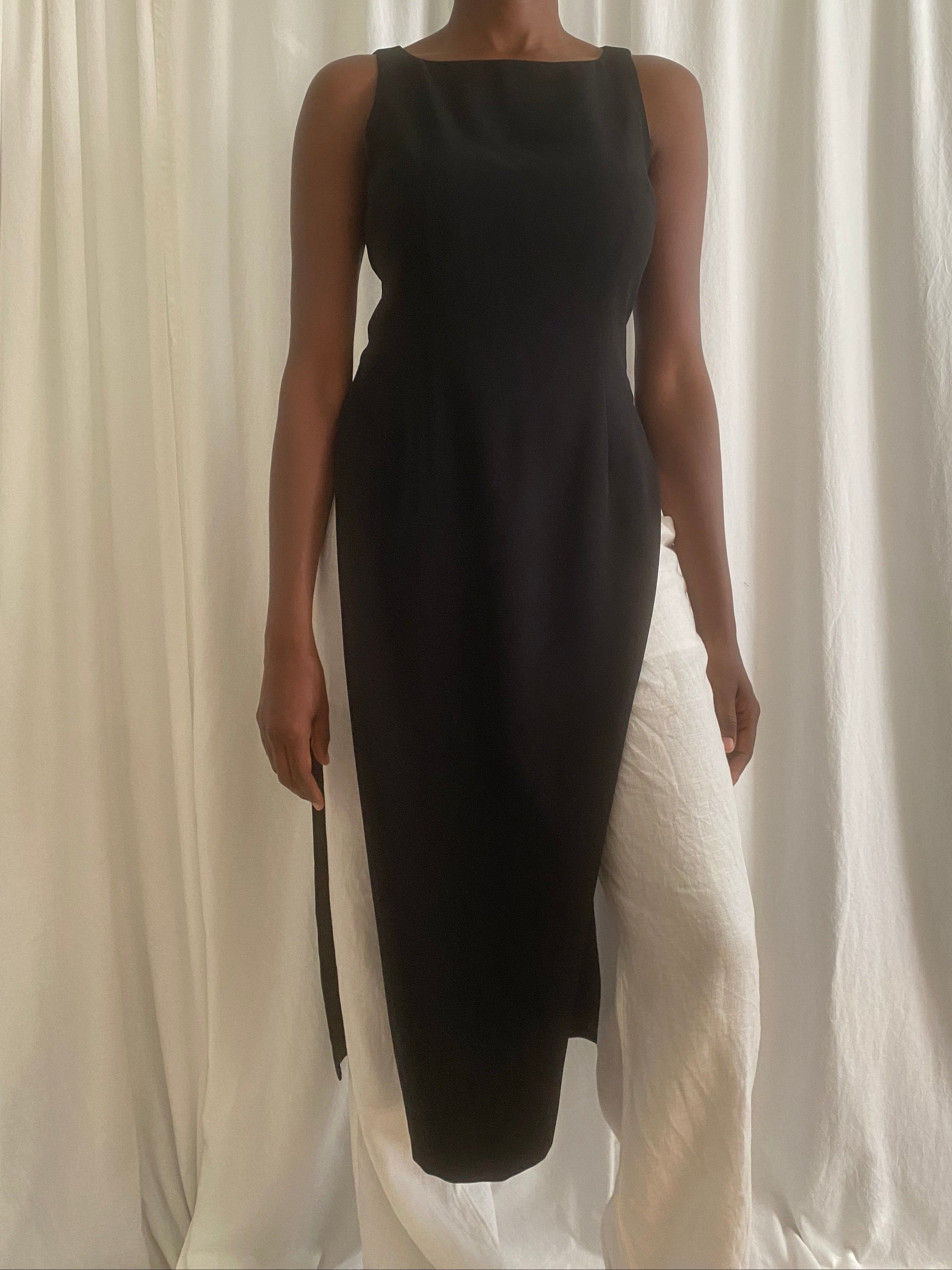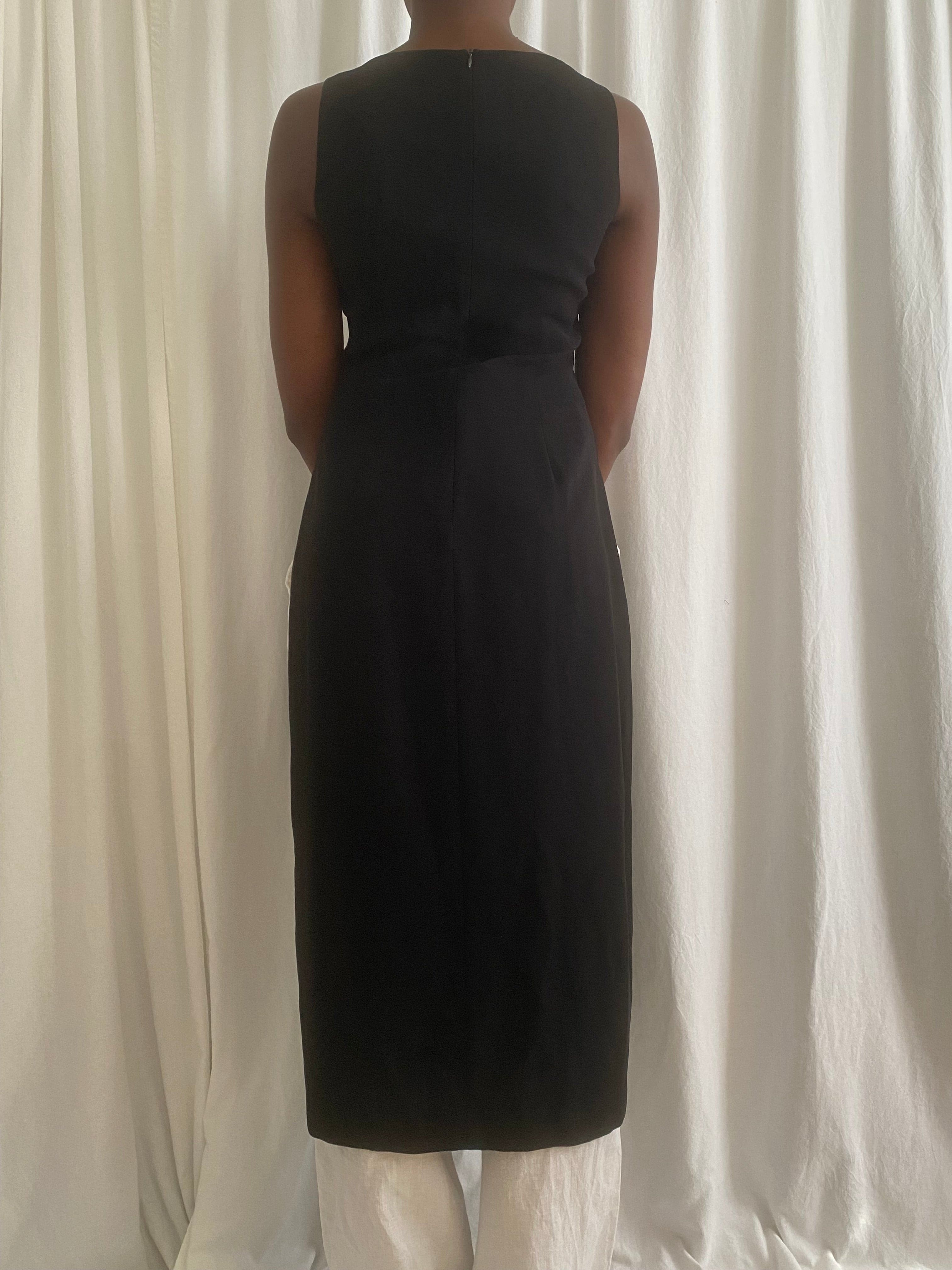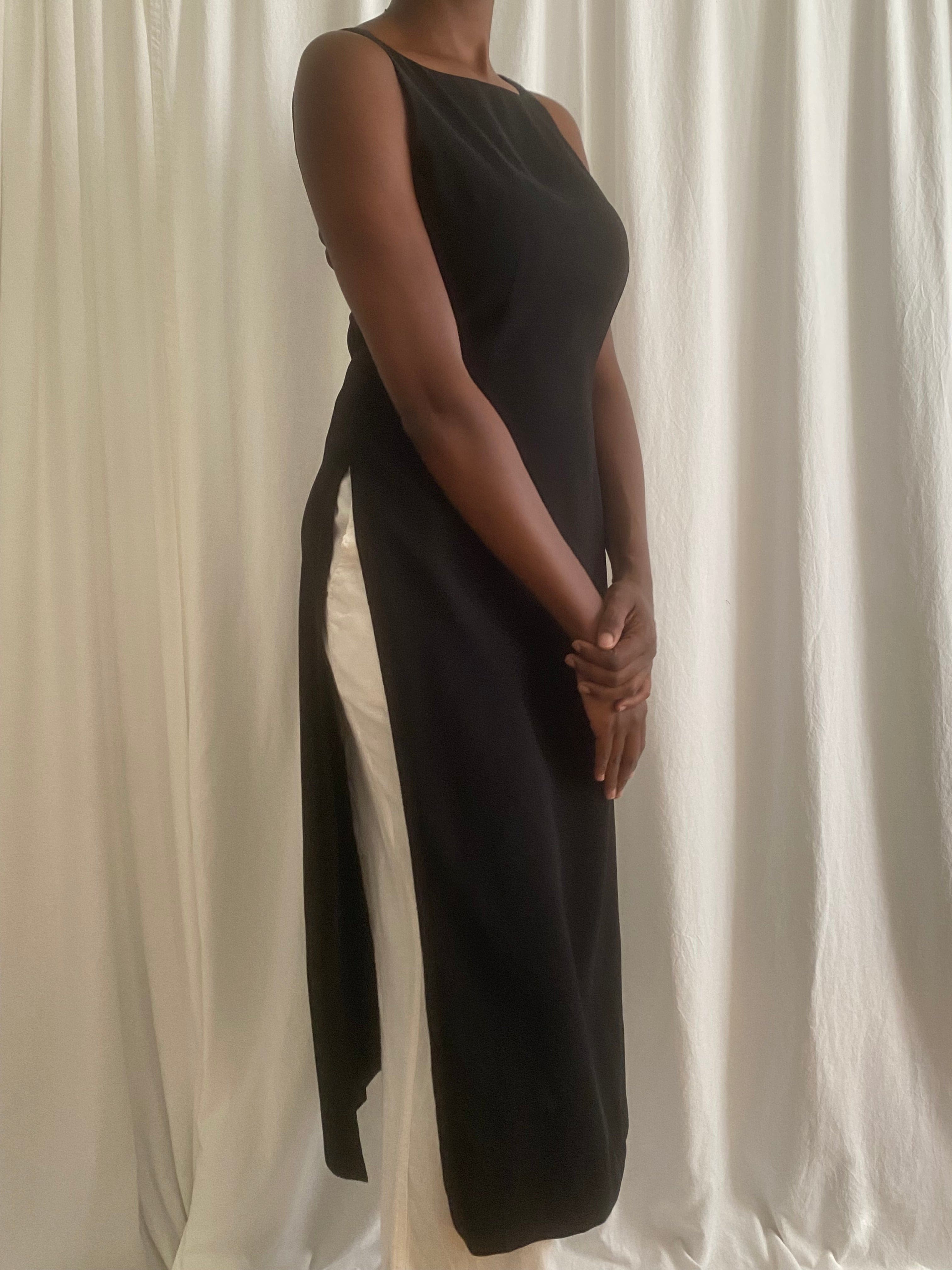 Vintage sleeveless shirt dress from the canadian brand Tristan & Iseult. Made like a long black dress with a slit up to the hip, on both sides. Very elegant and versatile.