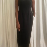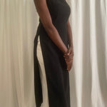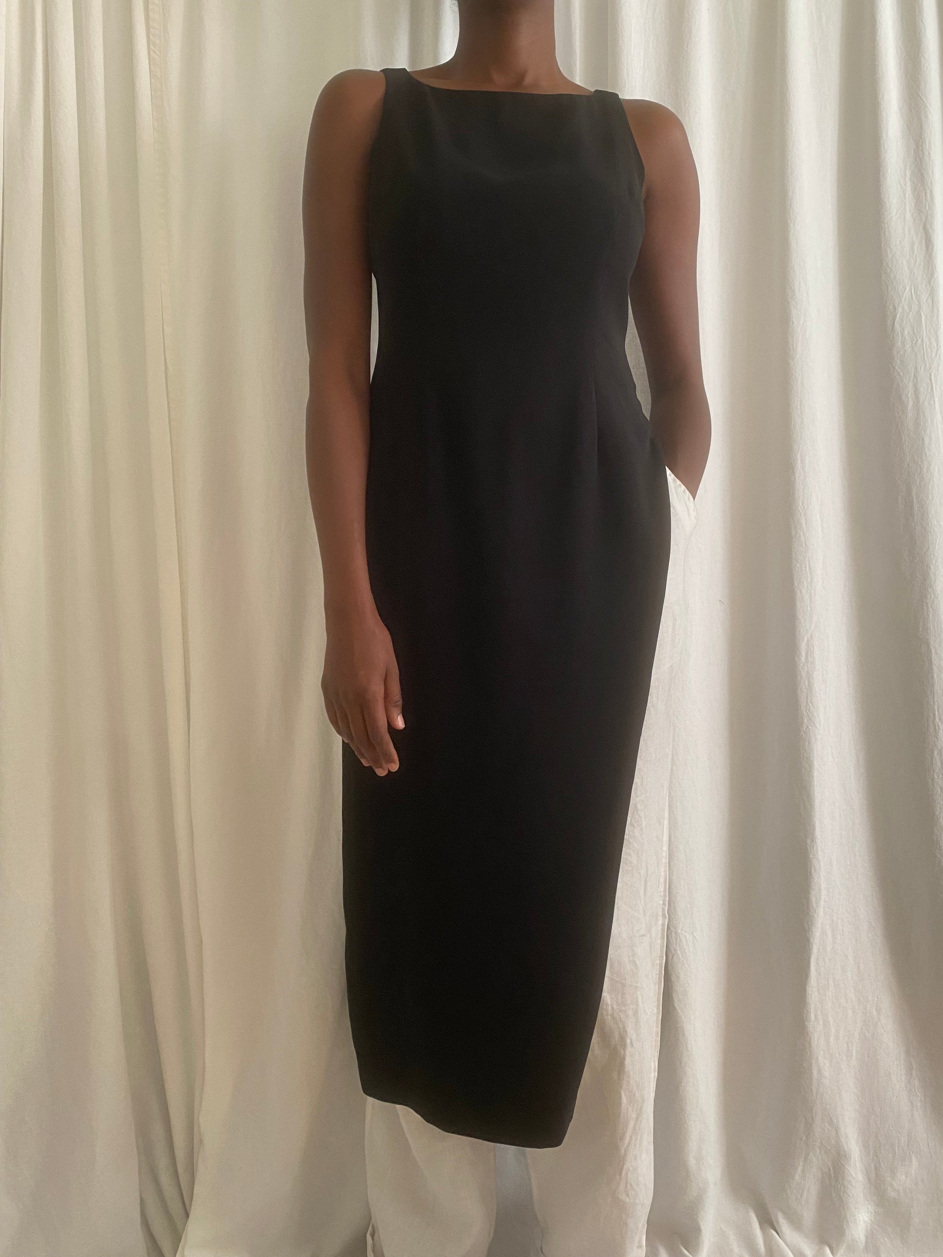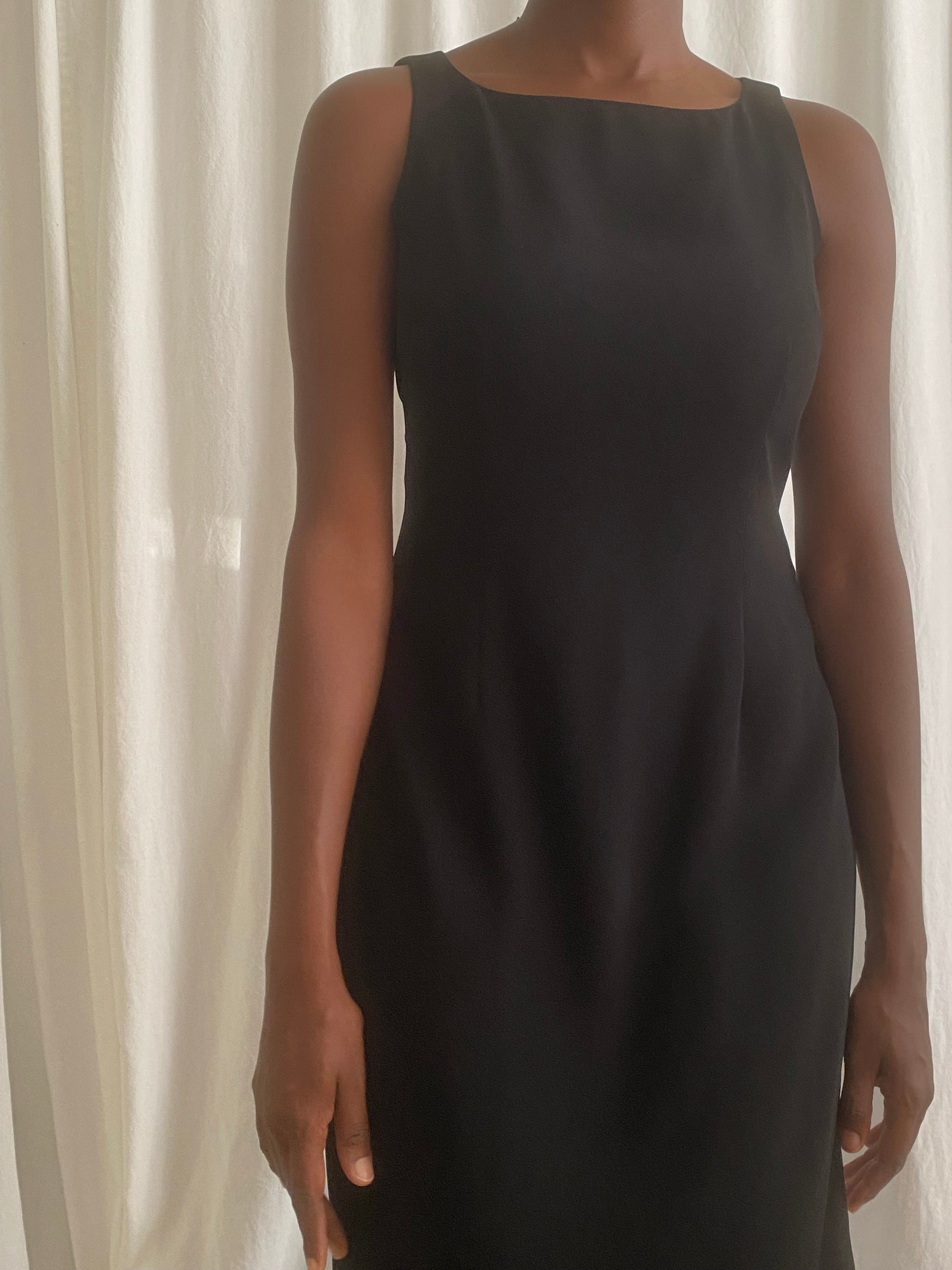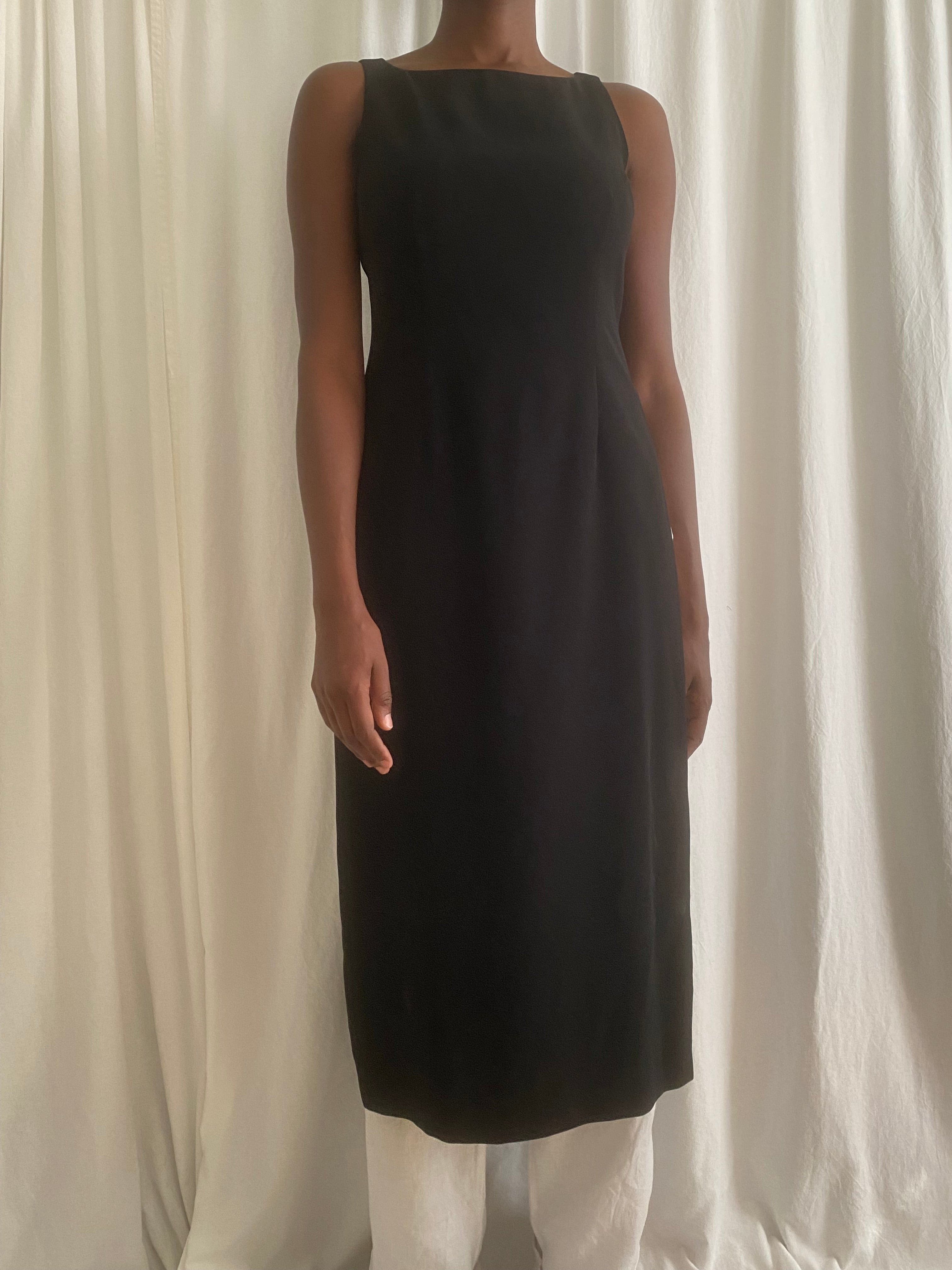 Vintage sleeveless shirt dress from the canadian brand Tristan & Iseult. Made like a long black dress with a slit up to the hip, on both sides. Very elegant and versatile.
