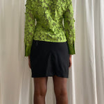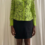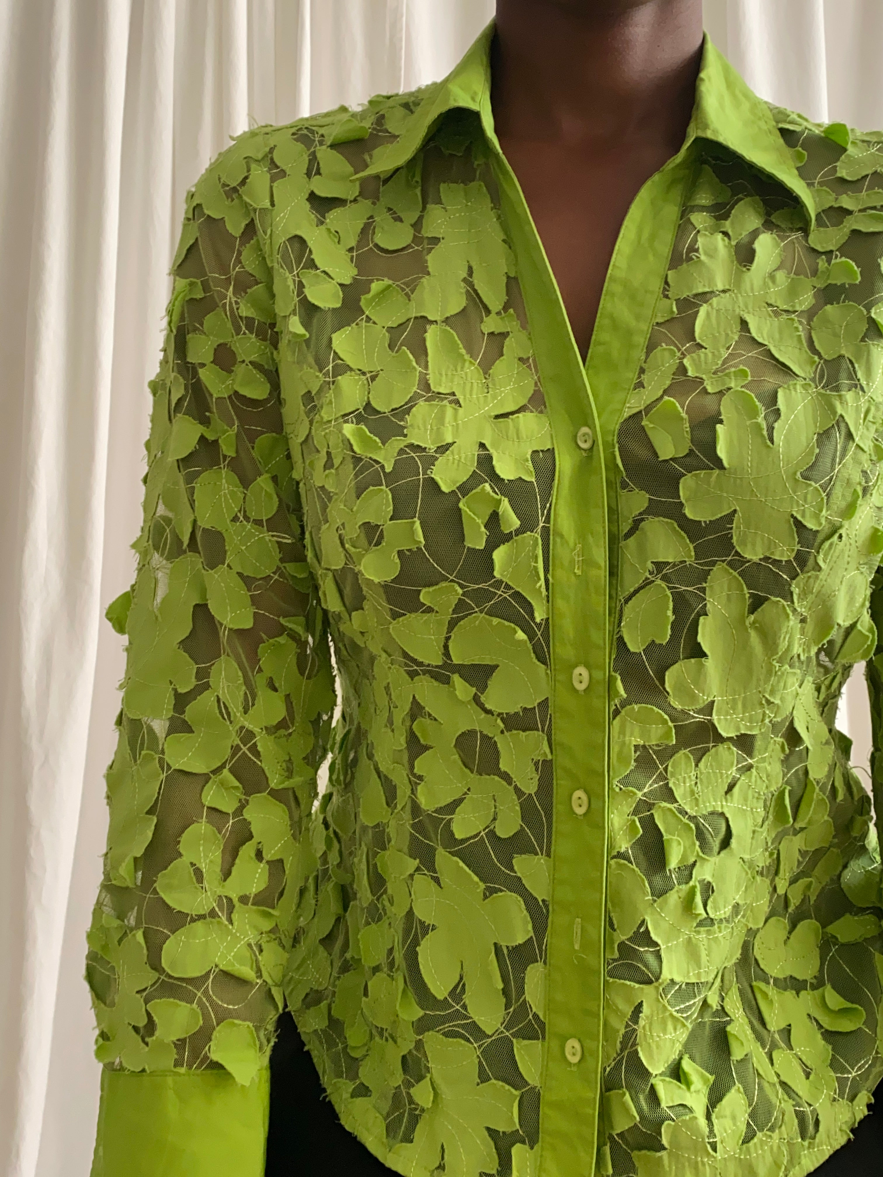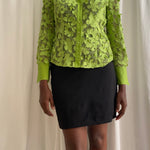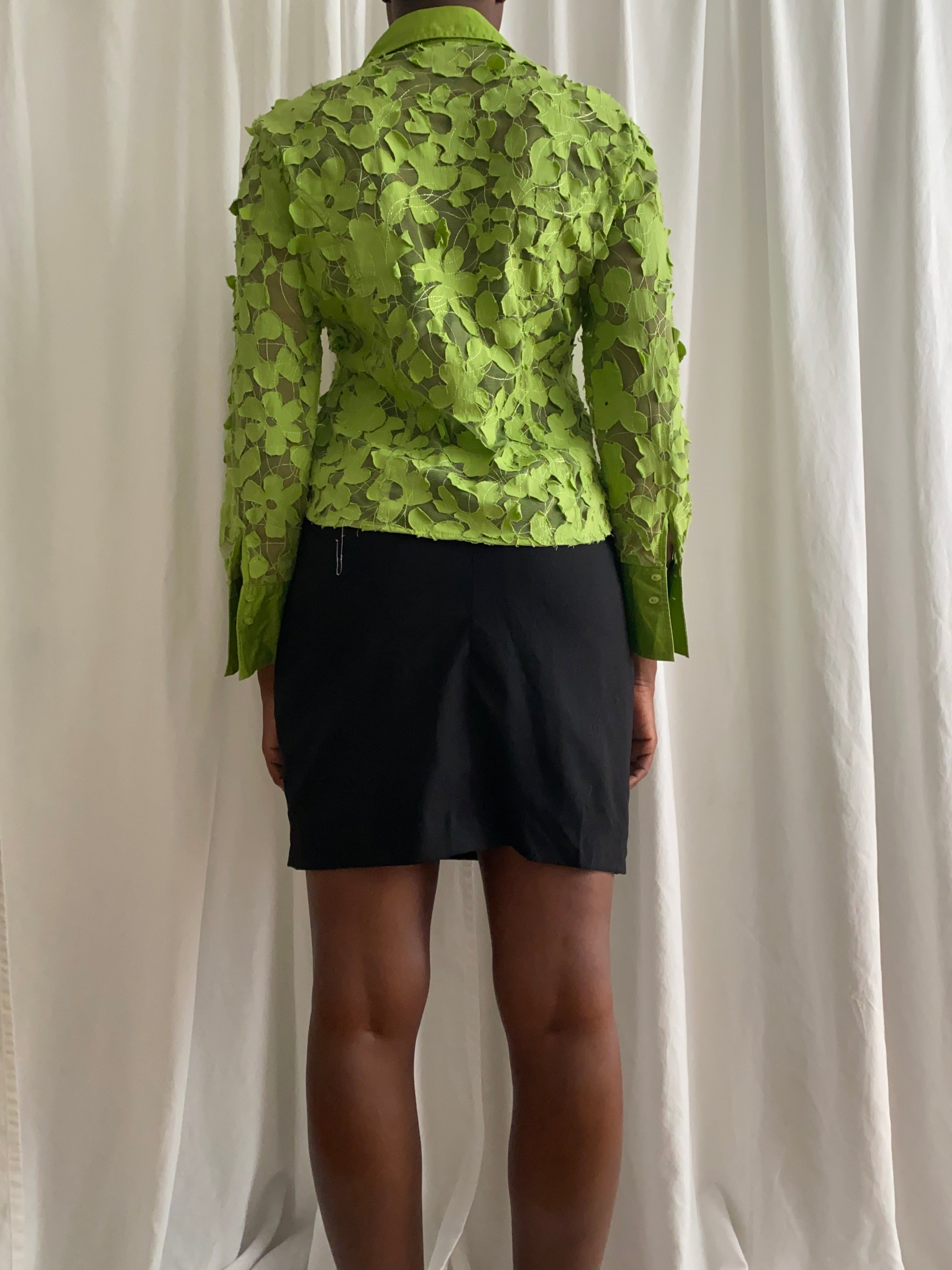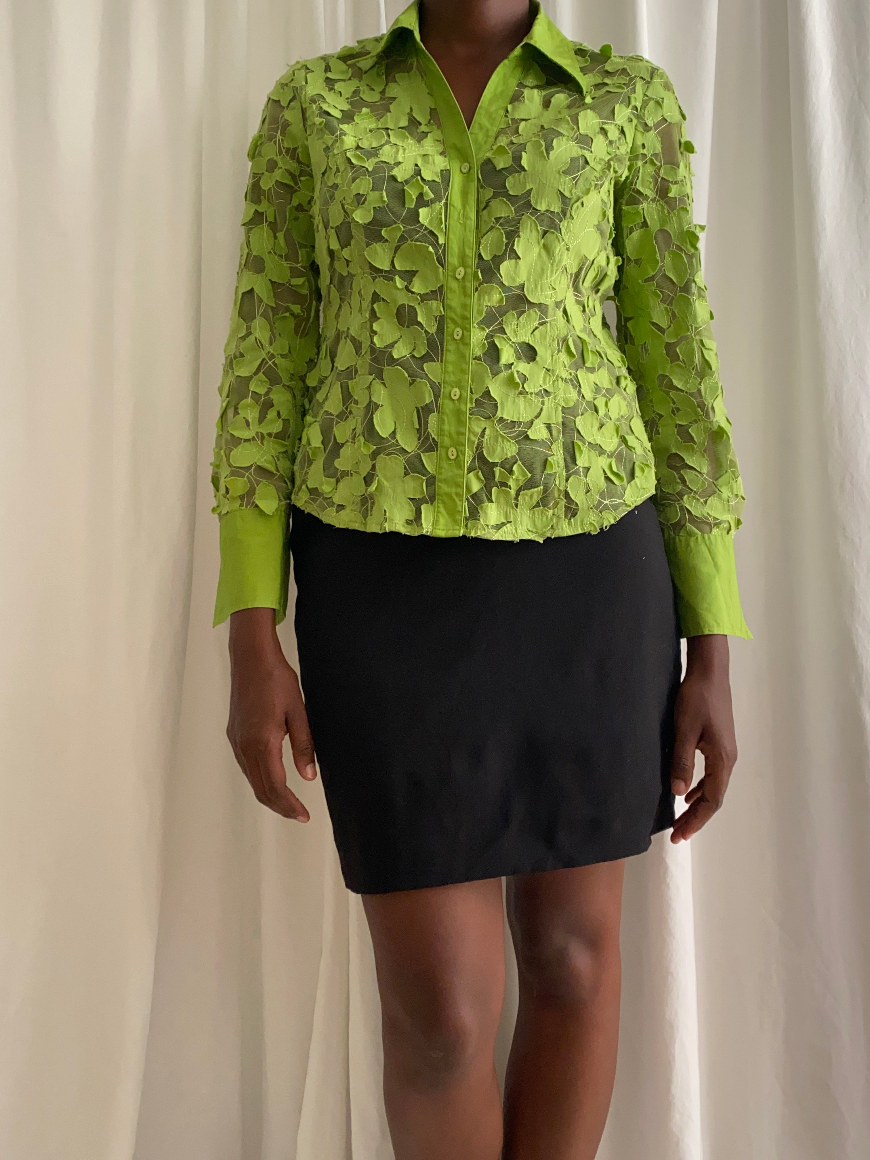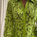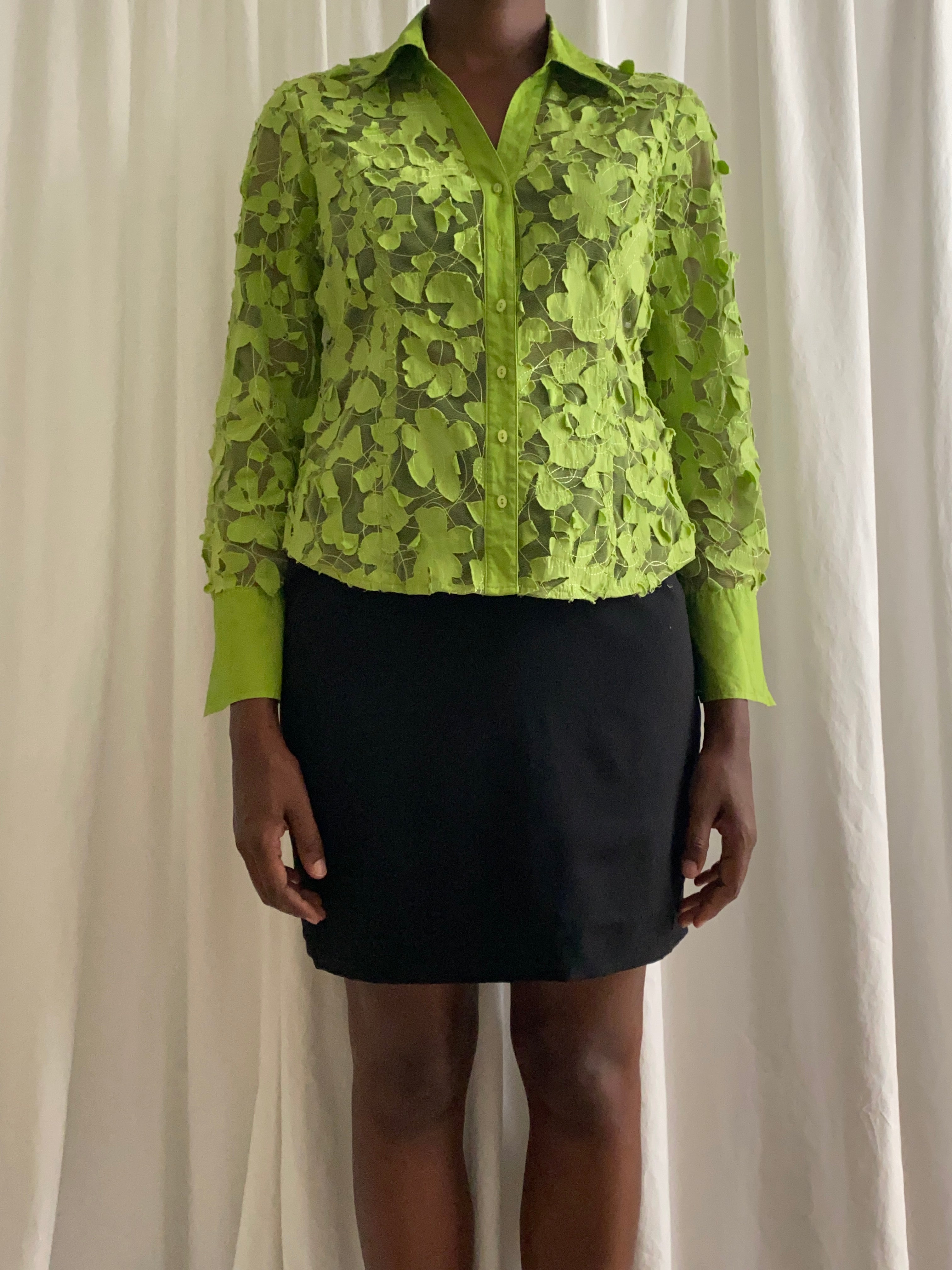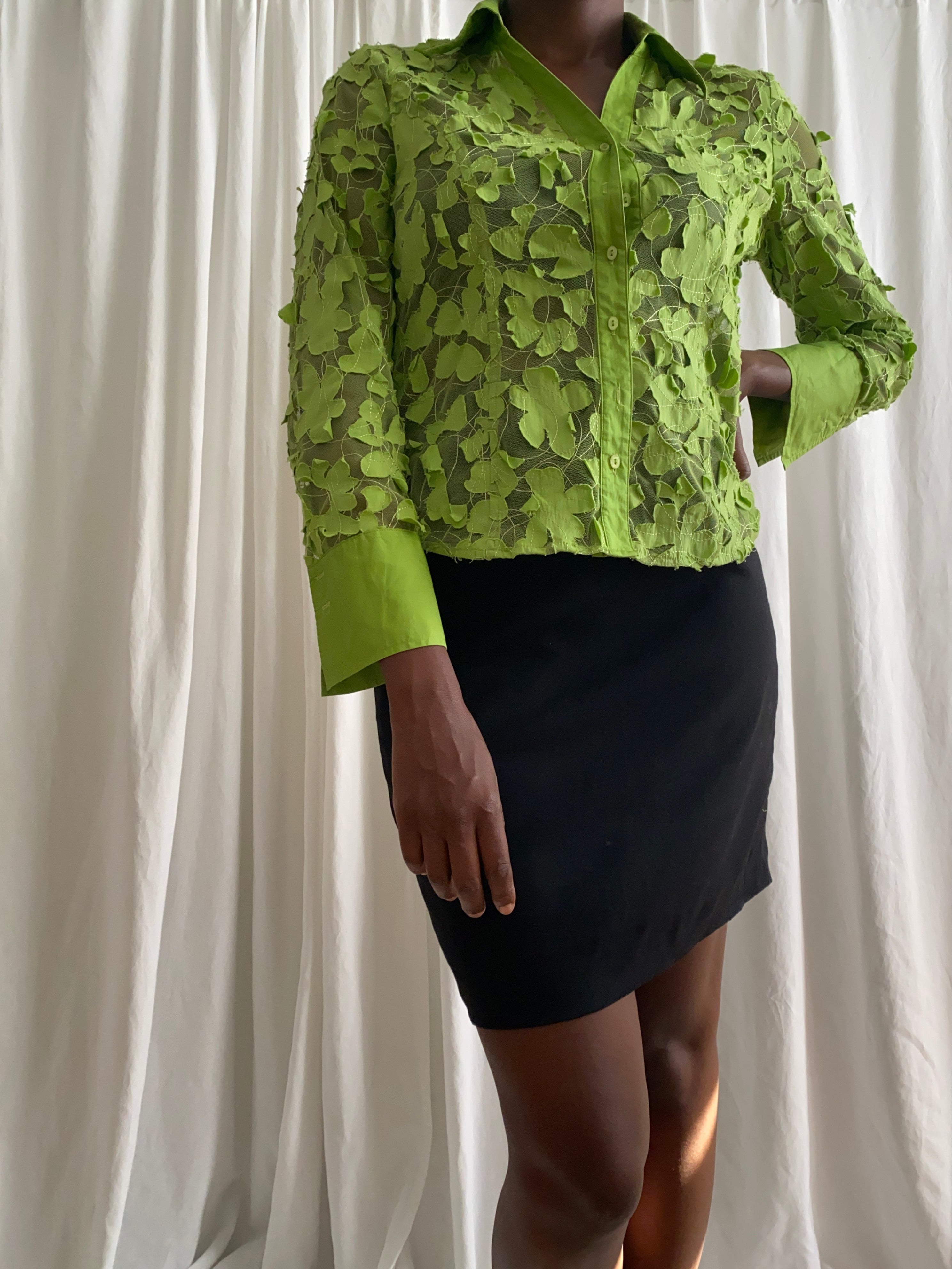 Unique blouse in a vibrant shade of green. The blouse comes in a sheer lace material and is covered with solid textured floral shapes embroidered all over.  Long sleeves, straight collar, front buttons. In excellent condition