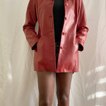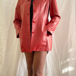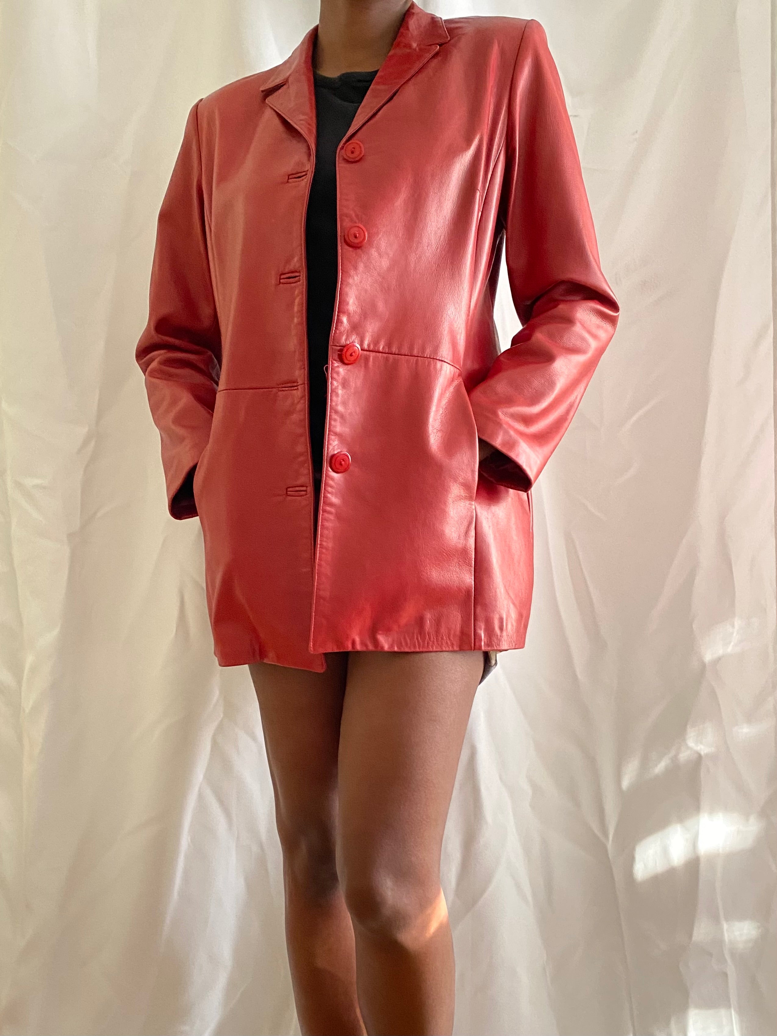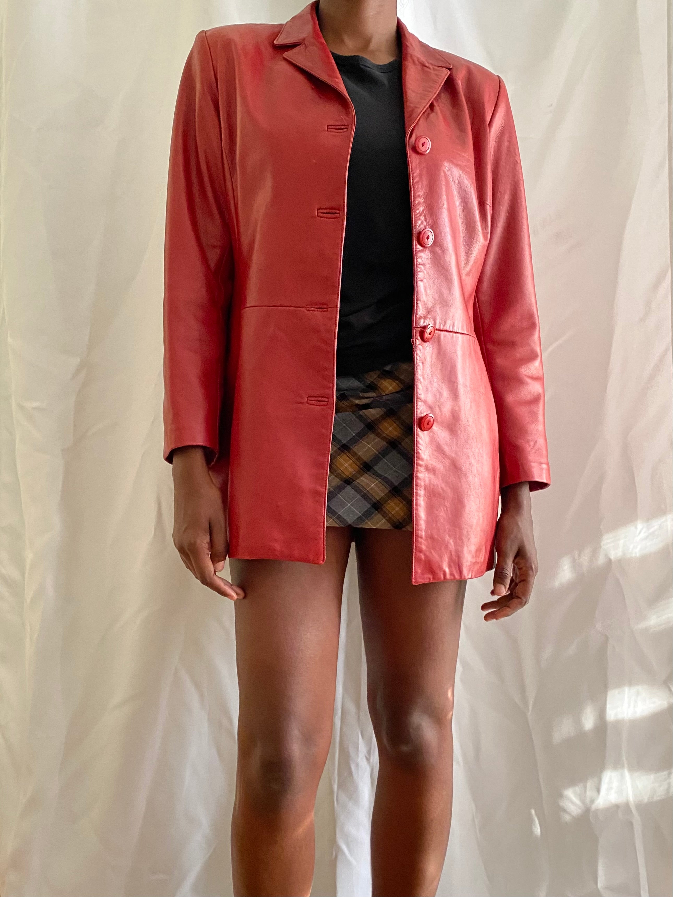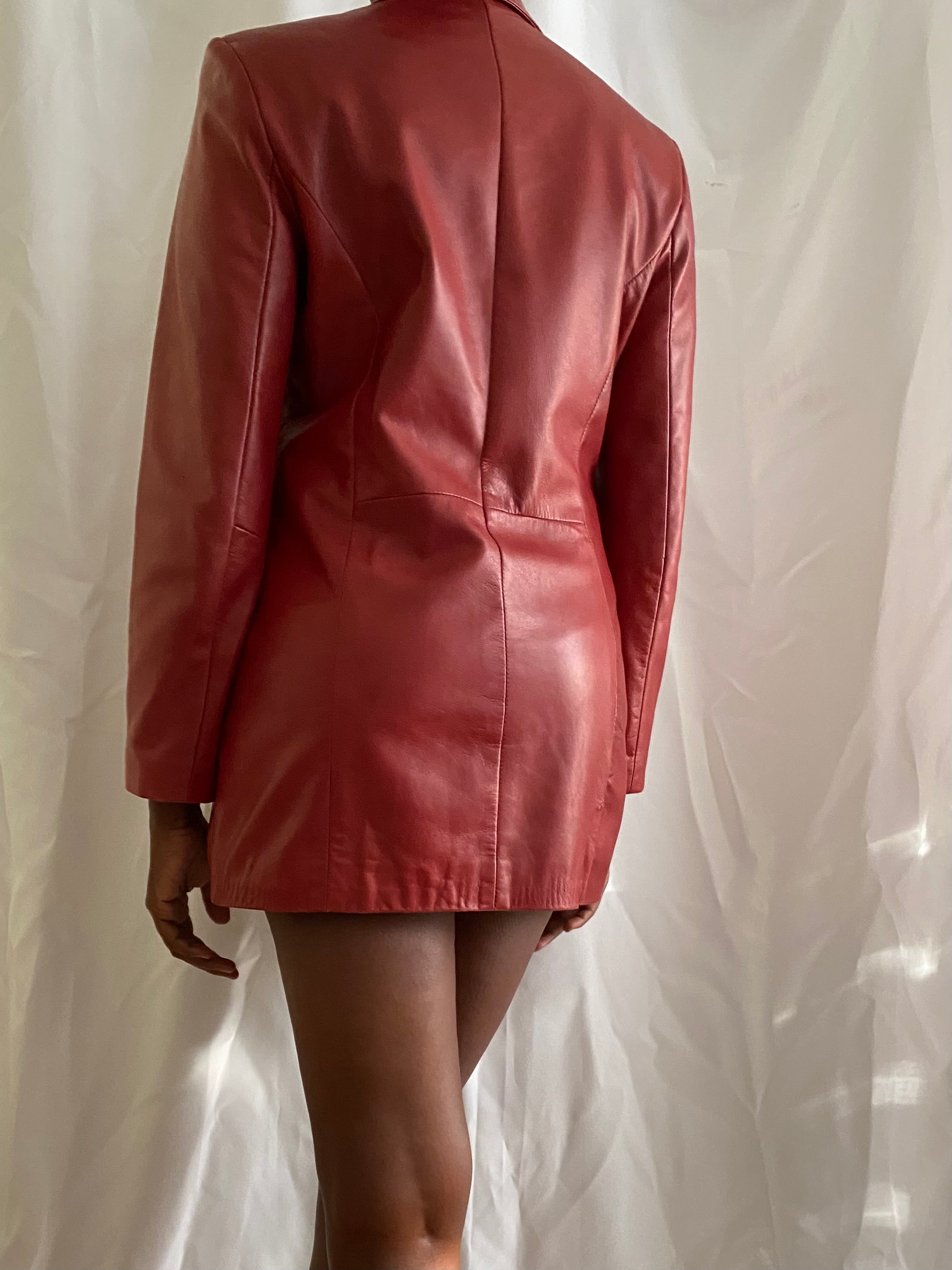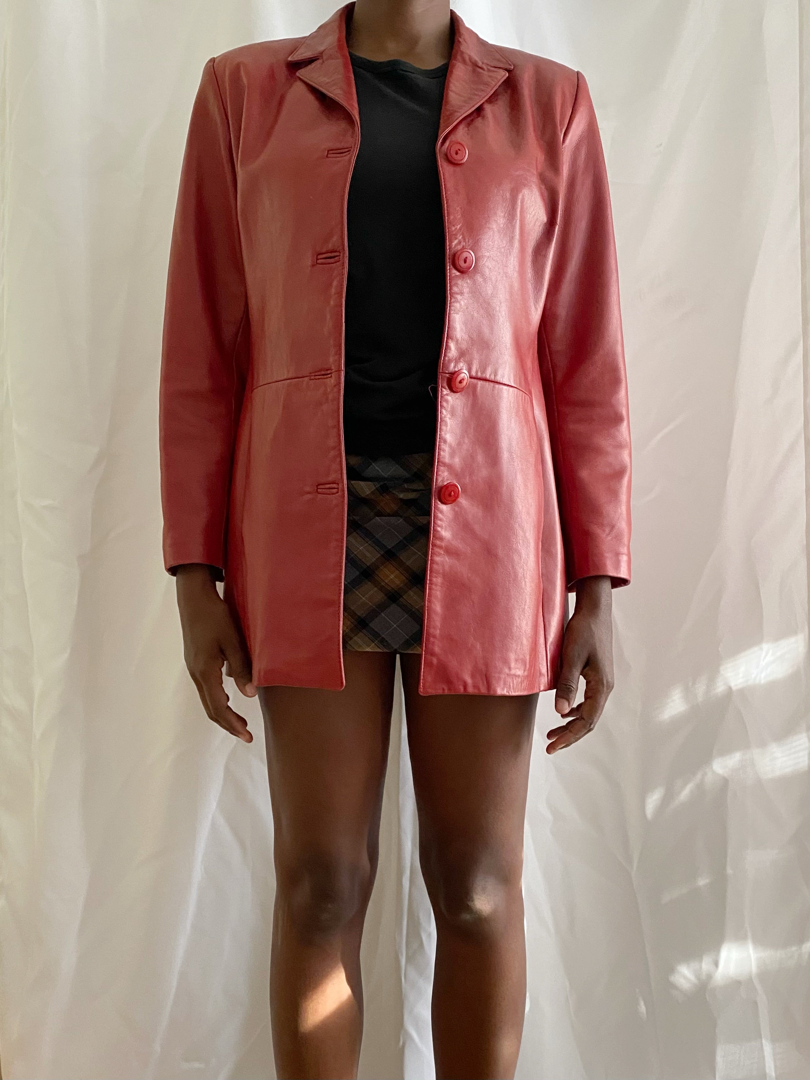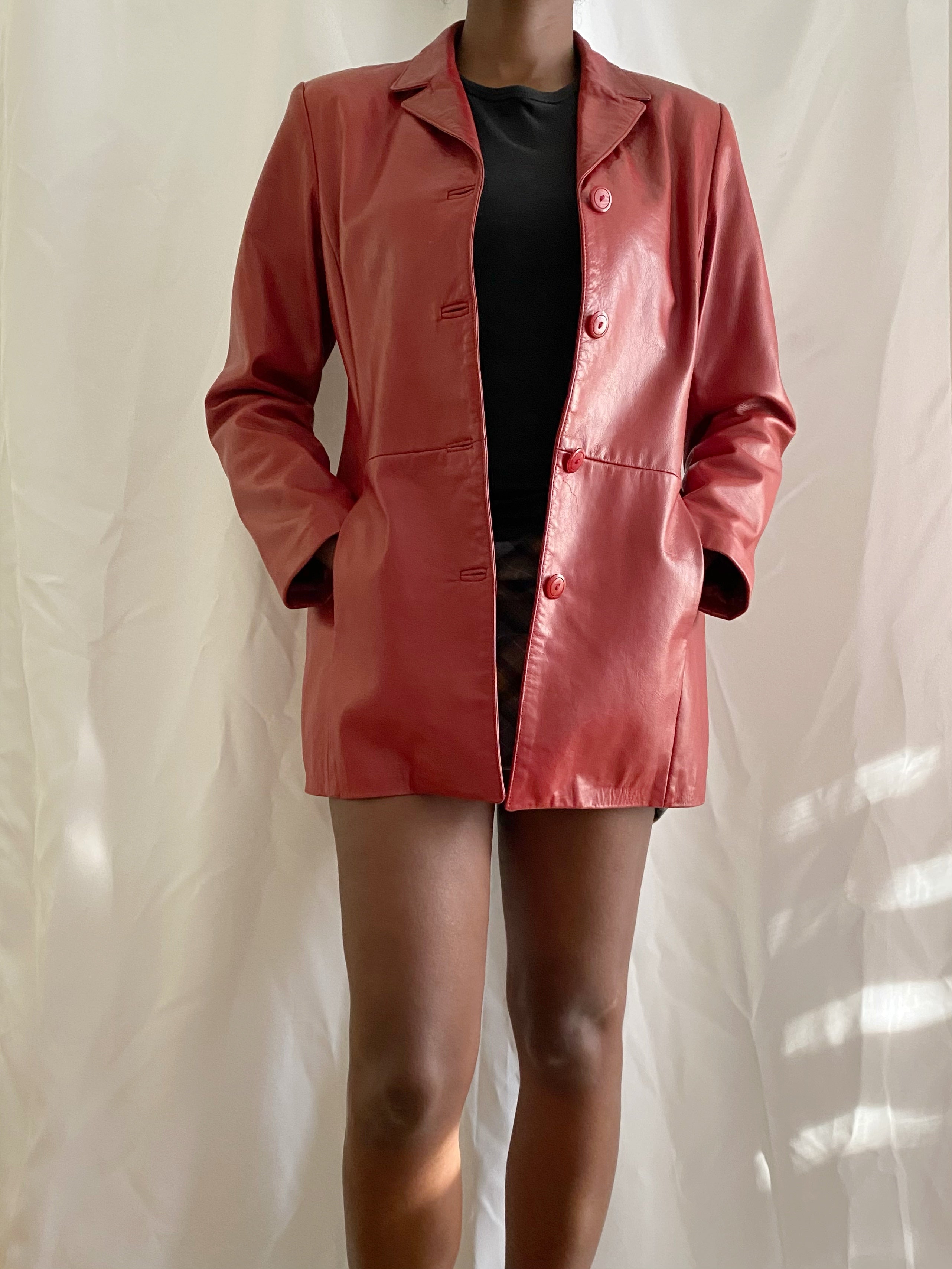 Gorgeous leather jacket/blazer in a beautiful shade of dark red.  Features lapel collar, front buttons and side pockets. The leather is very soft, there are a few signs of use, but overall great condition.  From Danier, made in Canada