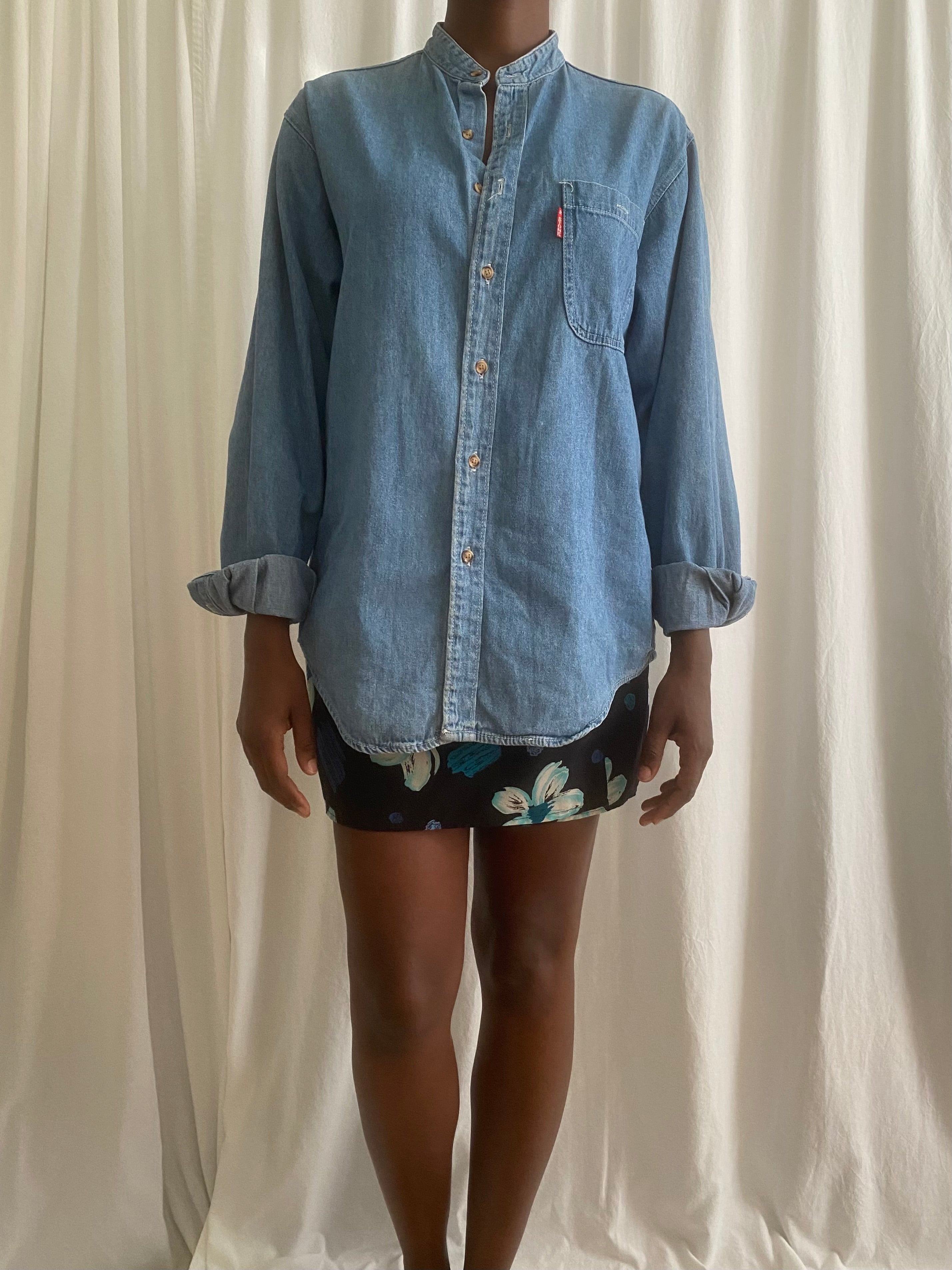 This vintage denim shirt is a must. Loose fit, boyfriend shirt in perfect condition.  Features long sleeves, front buttons in a contrasting beige and completed with mandarin collar.