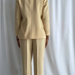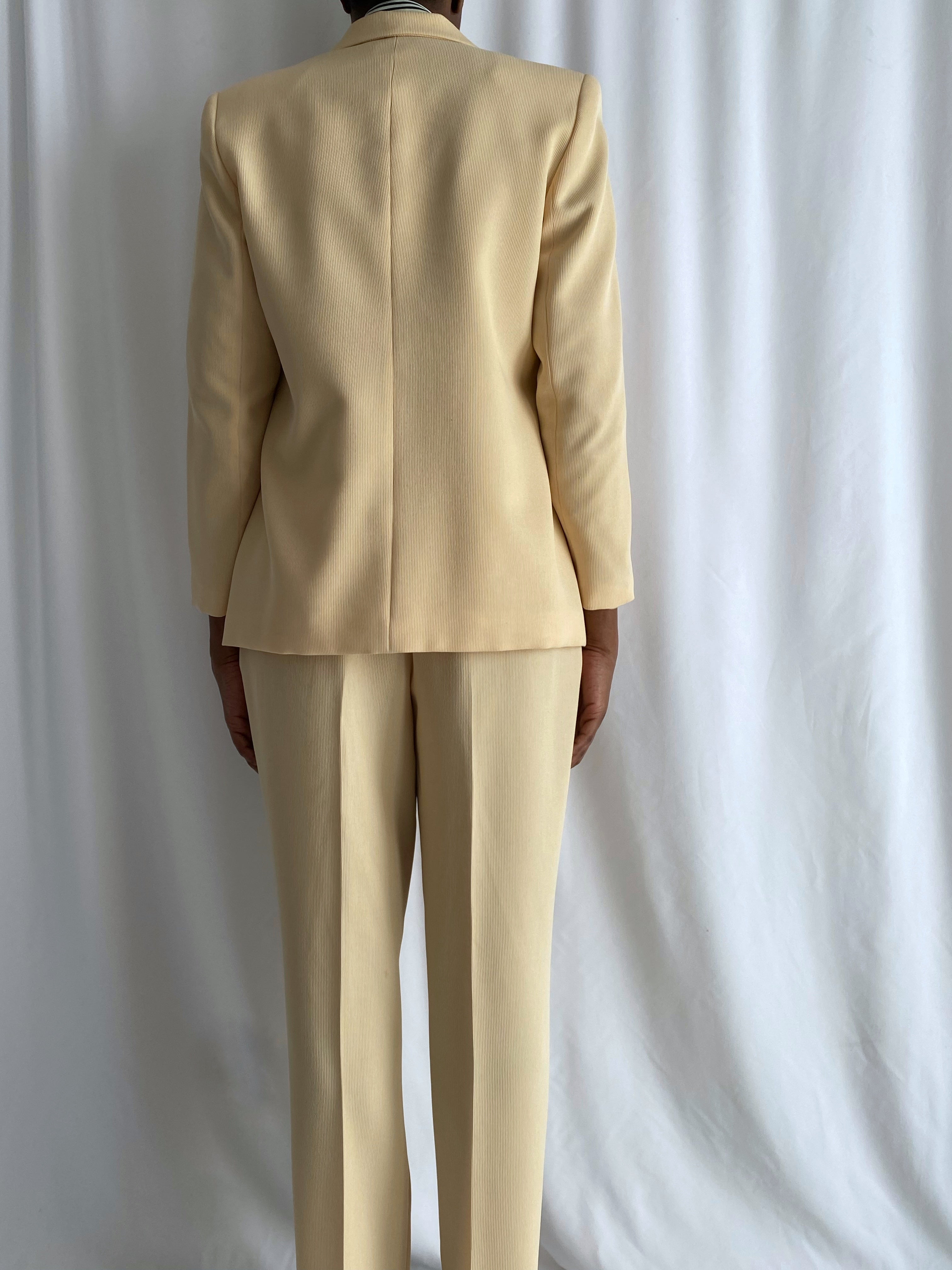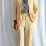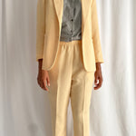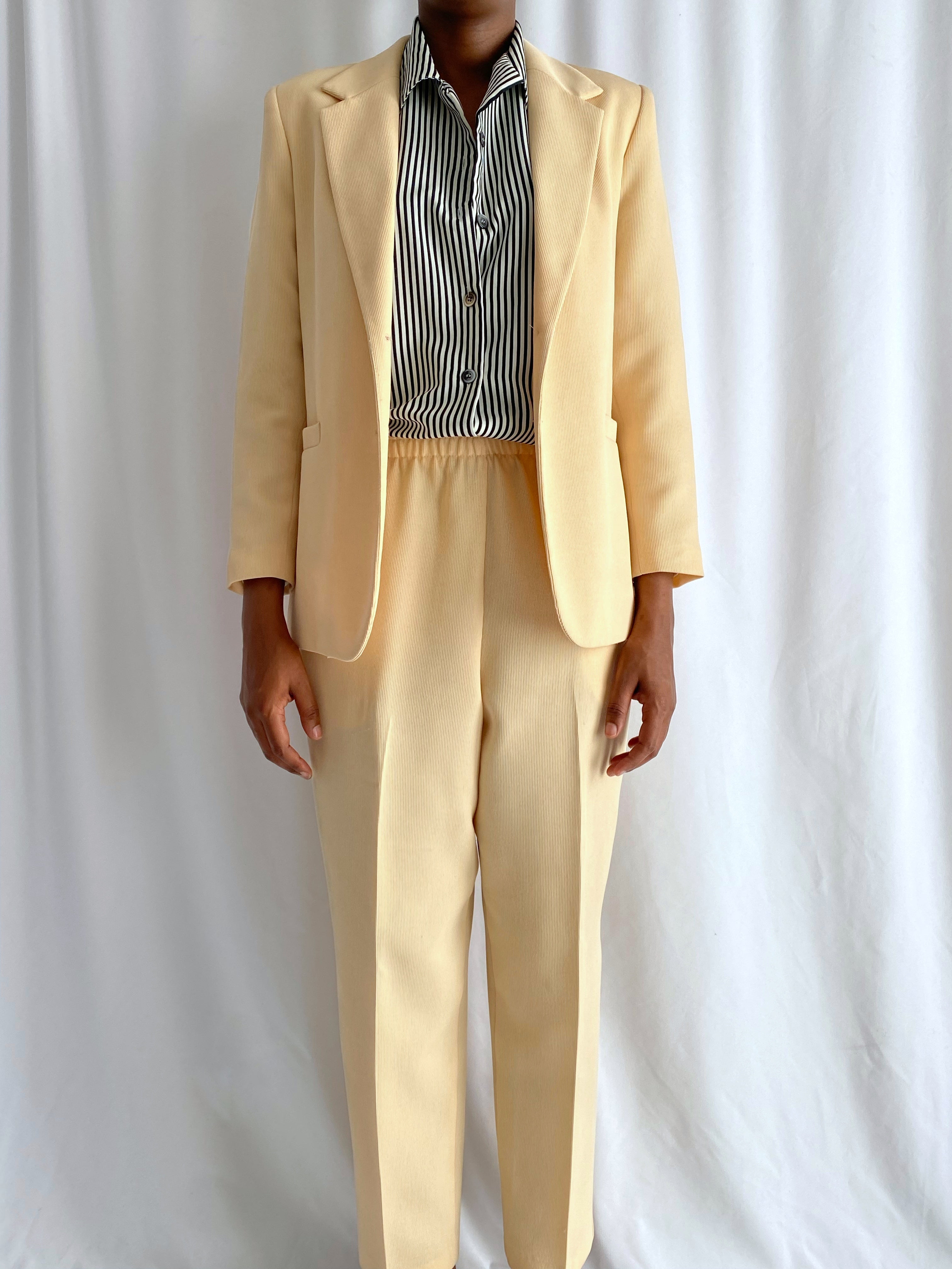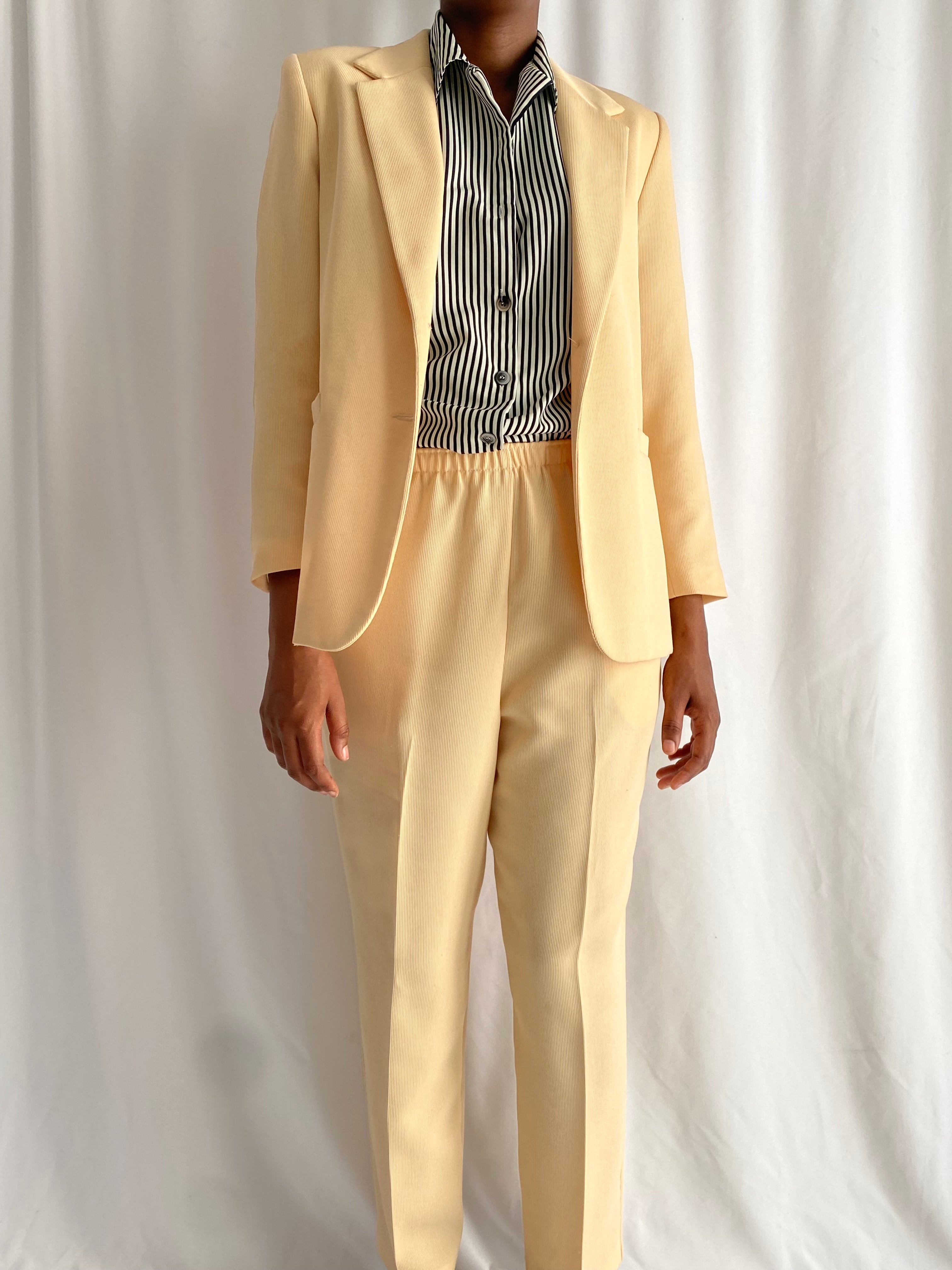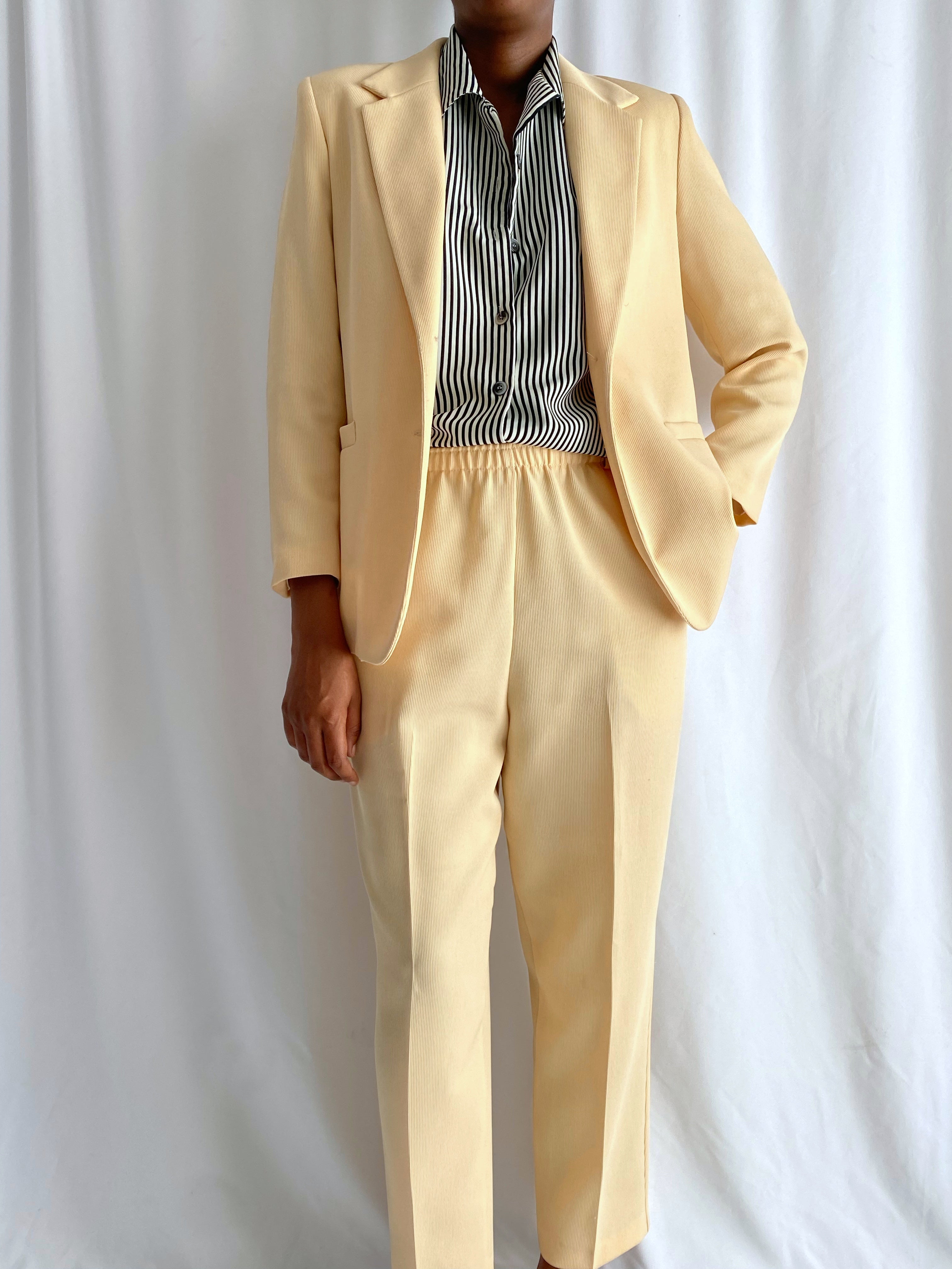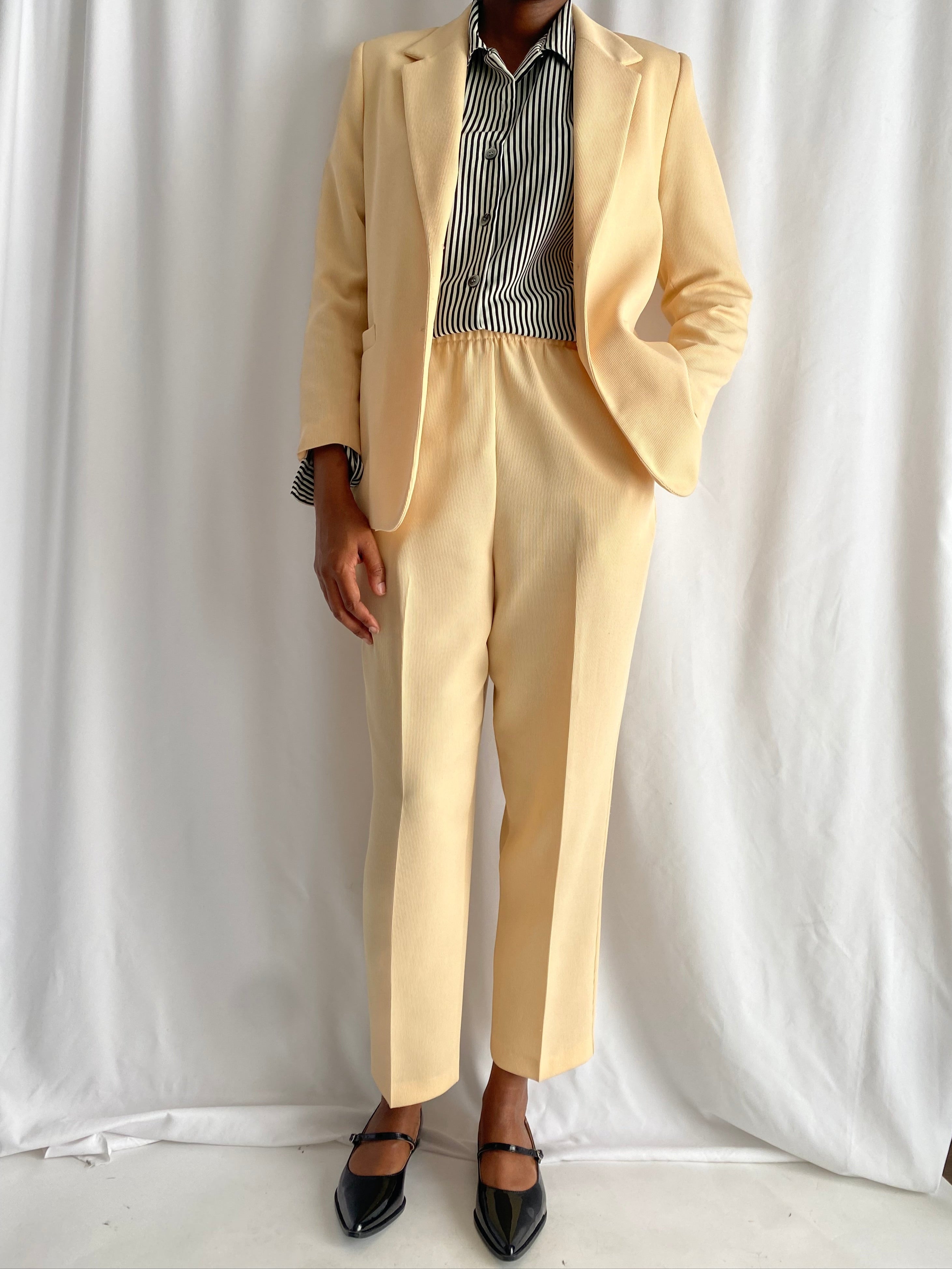 Beautiful vintage matching suit in a soft buttery yellow. Ligthweight material made in a comfortable cut.  The blazer features peak lapel with 2 front buttons and the trousers have an elastic waist with side pockets and straigth cut. Note the color is a soft neutral between yellow and beige